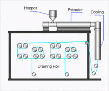 單絲 通過擠出機(jī)將高分子樹脂擠出細(xì)絲(如同從面條機(jī)中擠出面條一樣)形狀后進(jìn)行冷卻,再拉伸成細(xì)絲以增強(qiáng)細(xì)絲強(qiáng)度的成型方法。 單...