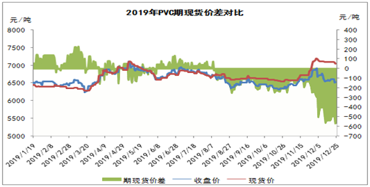 ????????近日,受市場供應面有一定提升以及下游接貨不佳影響,PVC行情轉入跌勢。PVC期貨偏弱震蕩,對現貨市場價格形成一定打壓,市場價格承壓下跌。此外,期現貨價差再創新高,最高達570元/噸左右。由上圖可以看出,進入2019年四季度,PVC期限價差逐漸擴大,基本維持在500-600元/噸之間,而期貨價格遠遠低于現貨價格,超出正常范圍。因此單從期現價差方面看,后期將逐漸修復步入正軌,現貨大幅下降的可能性偏大。