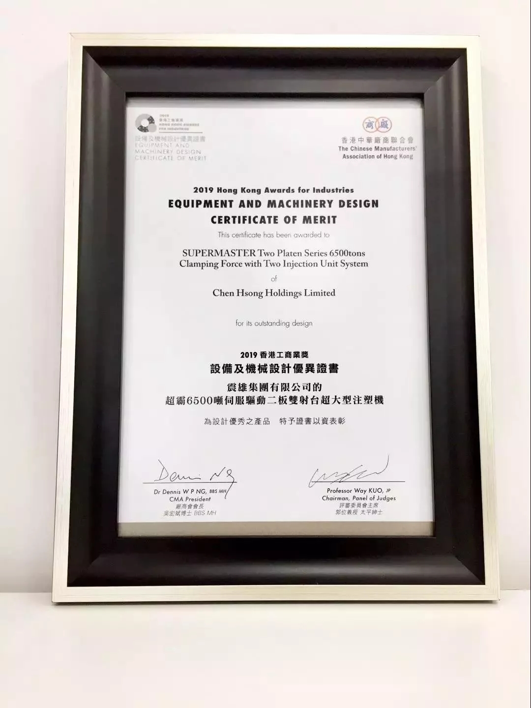 超霸6500噸伺服驅動二板雙射臺超大型注塑機獲得香港工商業獎之優異證書獎