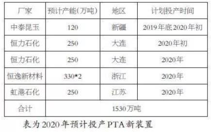 ????????恒力石化一套250萬(wàn)噸PTA裝置計(jì)劃2019年年底投放到市場(chǎng),另外一套250萬(wàn)噸PTA裝置計(jì)劃2020年投放到市場(chǎng)。