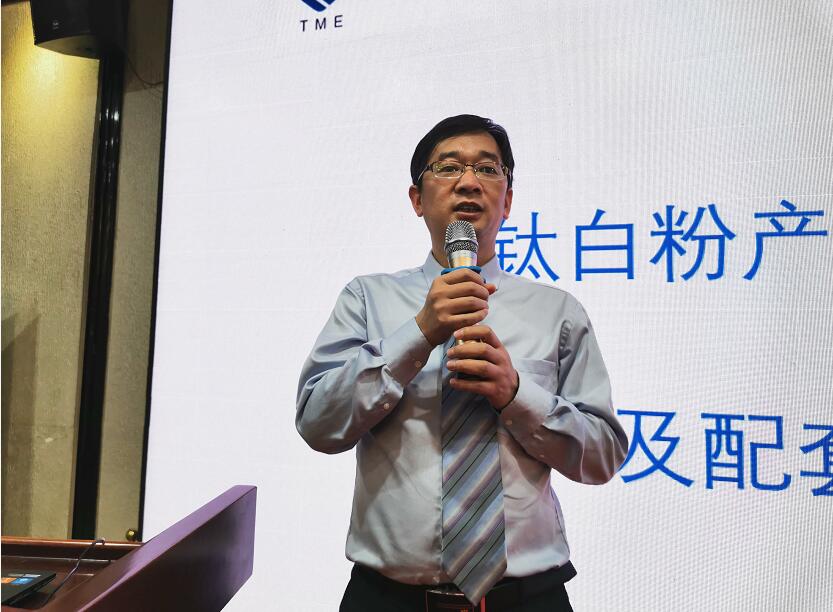 圖為壹化港(上海)網(wǎng)絡(luò)科技有限公司總經(jīng)理蔡緒波在會(huì)上作《鈦白粉產(chǎn)業(yè)融資需求及配套解決方案》的主旨報(bào)告。