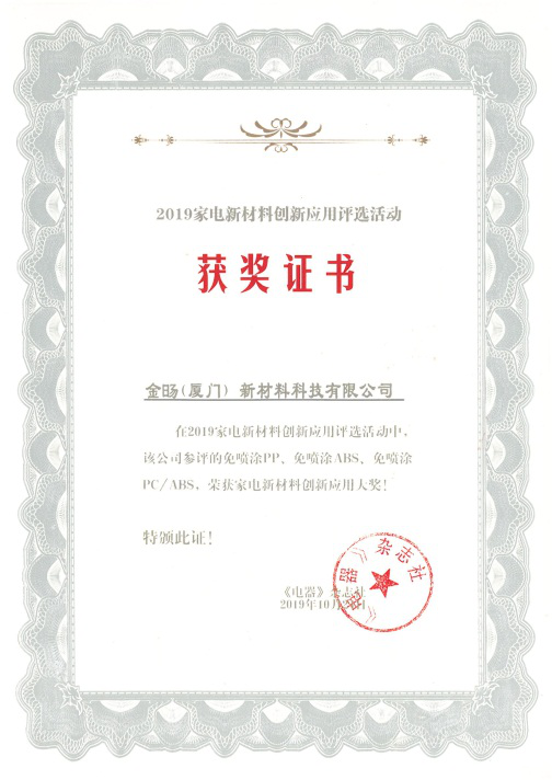 ????????改性塑料供應商金旸新材料近日獲得由國內家電行業權威媒體《電器》雜志社頒發的“家電新材料創新應用大獎”,該獎旨在推廣材料創新的優秀案例,讓中國家電企業通過對新材料的創新應用盡快實現產品升級。金旸新材料開發的免噴涂PP、免噴涂ABS、免噴涂PC/ABS三款環保材料在眾多參評產品中脫穎而出,經過專家組評定,獲得家電新材料創新應用大獎。