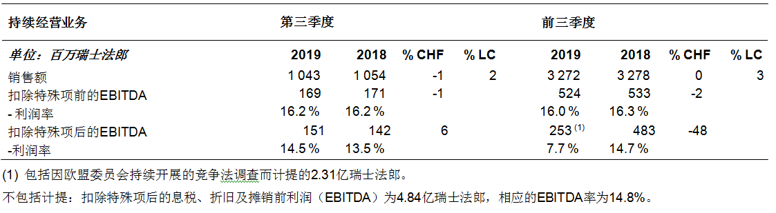 ????????不包括計(jì)提:扣除特殊項(xiàng)后的息稅、折舊及攤銷前利潤(rùn)(EBITDA)為4.84億瑞士法郎,相應(yīng)的EBITDA率為14.8%。