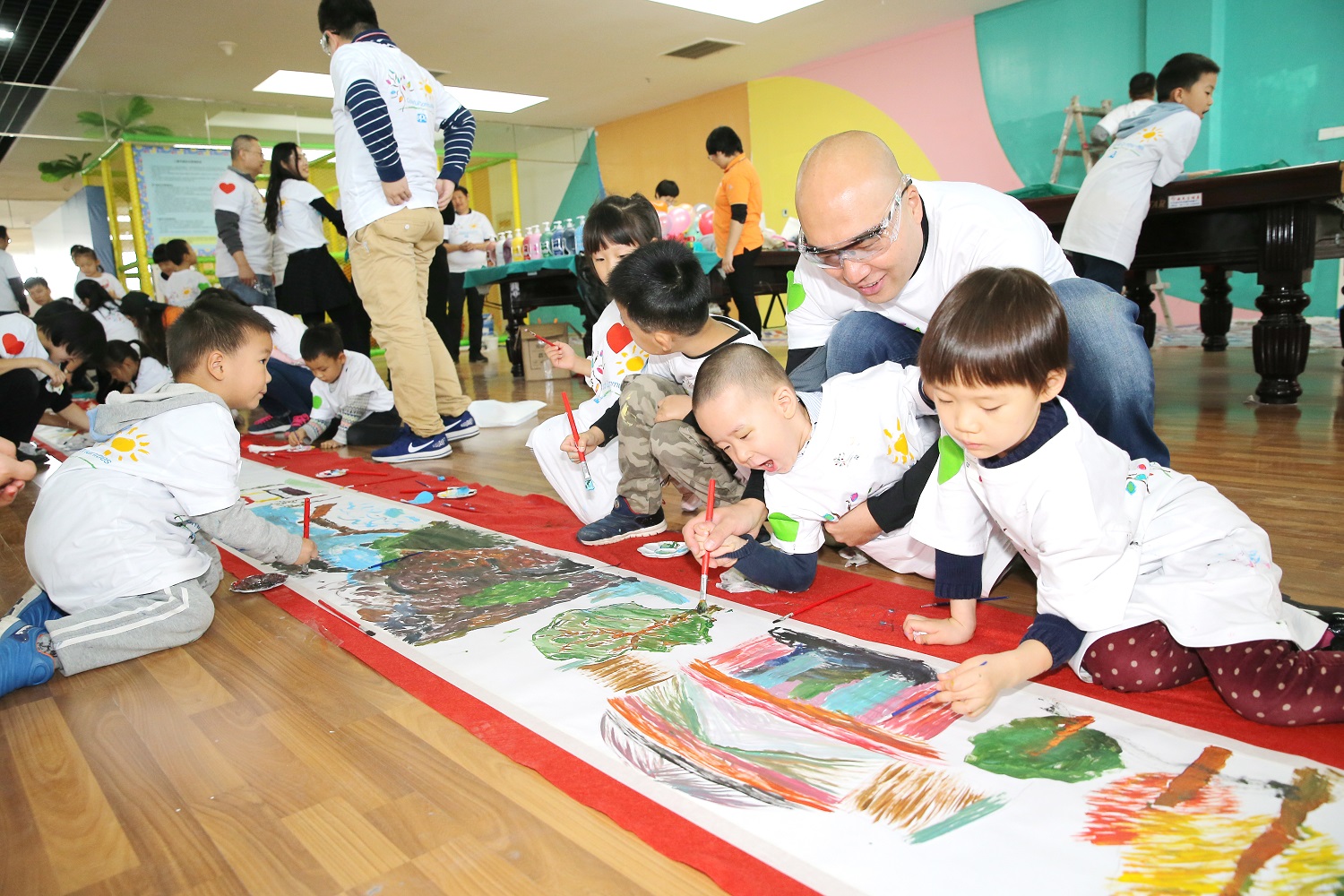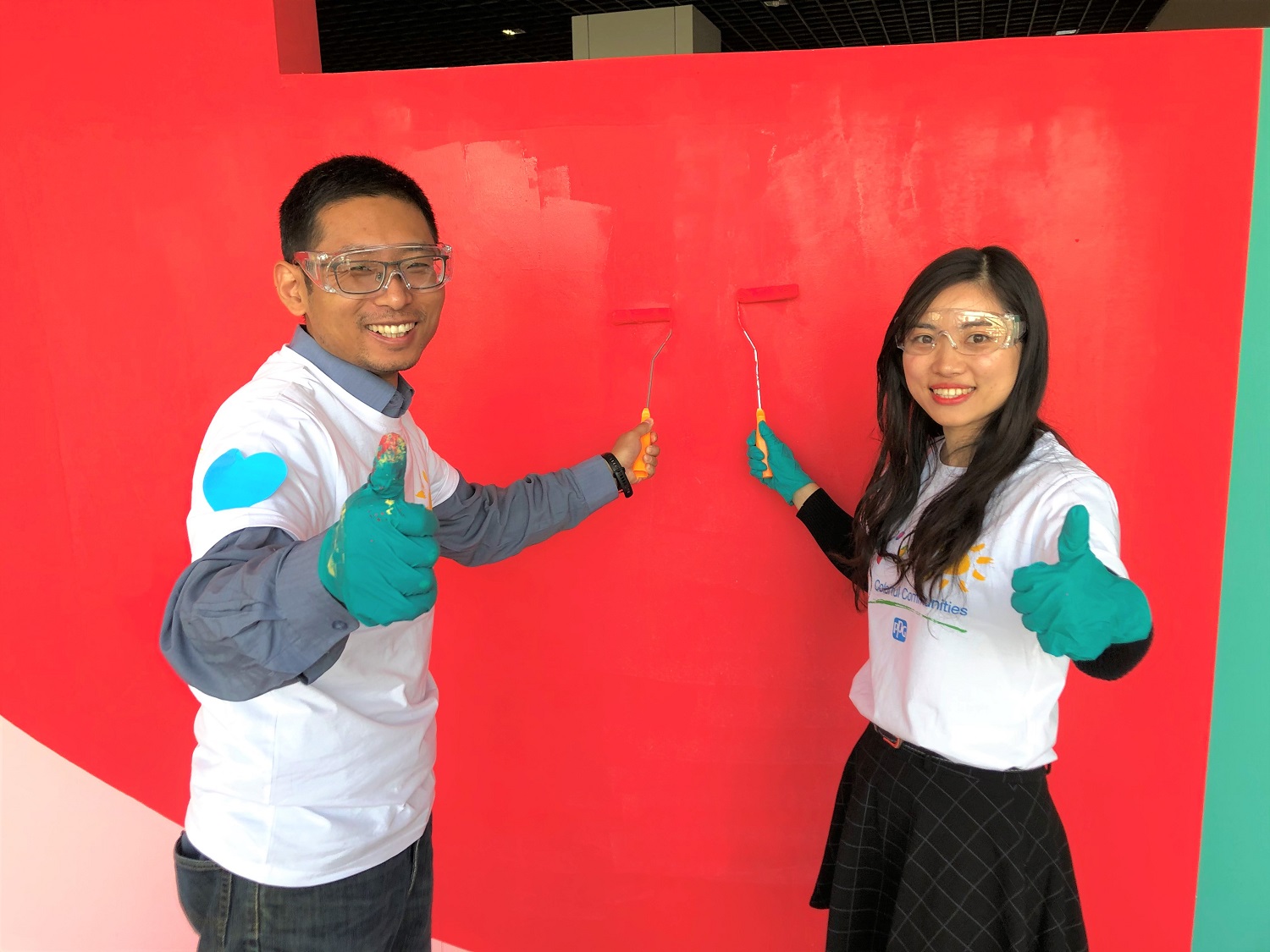 ????????受到文體活動中心建筑外立面為多種形狀的啟發,此次粉刷活動以“七巧板”為主題,運用了七種不同顏色來營造出了一個明亮歡快、充滿運動活力的活動空間。PPG志愿者和社區代表志愿者不僅對文體活動中心的活動室內墻與走廊進行了美化,還和他們的孩子一起繪制了有關航空和社區文化主題的長卷畫。