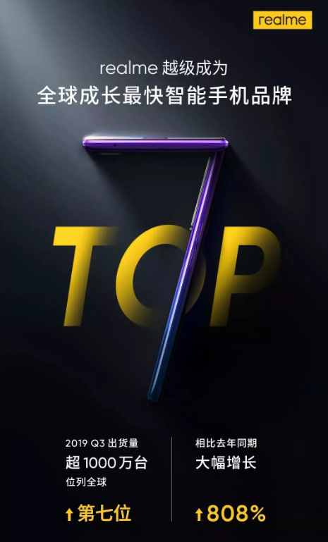 ????????據(jù)Counterpoint最新調(diào)研報告:realme手機(jī)第三季度出貨量超1000萬臺,同比增長808%,位列全球前7,成為全球成長最快的智能手機(jī)品牌。