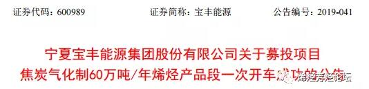 ????????公告顯示,焦炭氣化制60萬噸/年烯烴項目是寶豐能源首發(fā)上市募集資金投資項目,項目總投資金額達152.79億元。該項目主要分為兩段:前段焦炭氣化制220萬噸/年甲醇項目,后段甲醇制60萬噸/年聚烯烴項目,以及相關配套公用工程,預計將于2019年底前全部建成投產。