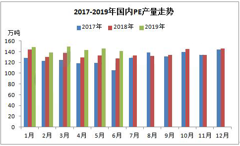 ????????據統計,2019年上半年國內PE產量在867.21萬噸,較2018年同期(802.68萬噸)增加64.53萬噸,增幅在8.04%。2019年上半年國內PE石化大修裝置較少,開工率較高在92%-98%之間波動。除此之外,內蒙古久泰能源28萬噸/年全密度裝置在5月份順利投產,6月份產量釋放產品逐步供應市場。
