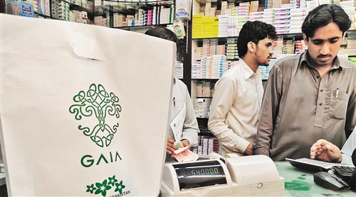 ????????巴基斯坦政府日前頒布“禁塑令”,首都伊斯蘭堡全面禁止使用一次性不可降解塑料袋,違反者將受到嚴厲處罰。旁遮普省、信德省等地也將很快實施類似法規。圖為藥店提供的收費環保袋。