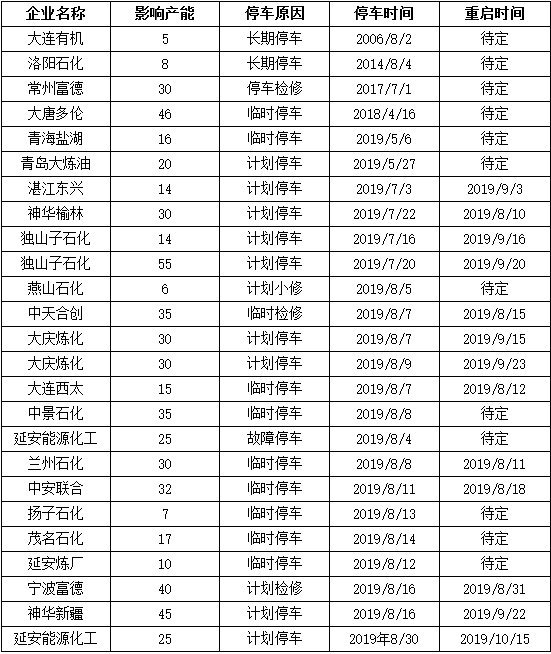 ????????2019年8月份新裝置投產情況匯總
