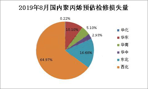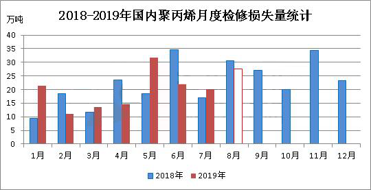 ????????2019年8月份,國內(nèi)聚丙烯檢修損失量預計在27.63萬噸,環(huán)比(2019年7月份20.12萬噸)增加7.51萬噸,增幅在37.33%;同比(2018年8月30.66萬噸)減少3.03萬噸,減少9.9%。2019年1-8月份,預計累積檢修損失量為162.15萬噸,較去年同期(2018年1-8月164.11萬噸)略有減少,降幅1.2%。
