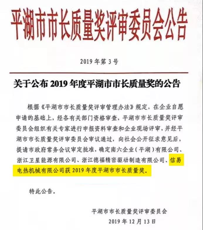 平湖市市長質(zhì)量獎是平湖市人民政府設(shè)立的最高質(zhì)量獎項,由平湖市政府表彰和獎勵,每年度評審一次,每屆不超過5個。該獎項旨在發(fā)揮市長質(zhì)量獎的導(dǎo)向作用,推動企業(yè)實施卓越績效模式和先進(jìn)質(zhì)量管理方法,深入開展質(zhì)量管理創(chuàng)新、質(zhì)量強企創(chuàng)建活動,樹立質(zhì)量標(biāo)桿,加強典型示范,加快推進(jìn)質(zhì)量強市建設(shè),促進(jìn)經(jīng)濟轉(zhuǎn)型升級。平湖信易2019年度獲此殊榮,深感榮幸,同時亦感到責(zé)任之深重,今后信易將繼續(xù)在精益管理,保證質(zhì)量,做好品牌等方面努力進(jìn)取,追求卓越,為塑膠輔機行業(yè)做出更大的貢獻(xiàn)。
