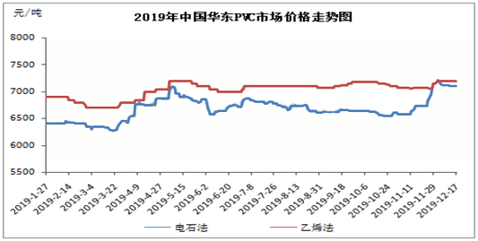 2019年,PVC行情可謂是變化無常,全年呈現(xiàn)旺季不旺、淡季不淡的特點(diǎn)。與往年不同,全年價(jià)格最低點(diǎn)出現(xiàn)在3月份,而價(jià)格最高點(diǎn)出現(xiàn)在12月。截止12月中旬,PVC市場價(jià)格創(chuàng)新高后出現(xiàn)回落,各主銷地區(qū)市場價(jià)格陸續(xù)小幅松動(dòng),貿(mào)易商出貨多隨行就市為主,個(gè)別小幅讓利,下游依舊維持剛需,受利潤空間影響,接貨并不積極。PVC期貨偏弱震蕩以及市場貨源緊缺狀態(tài)有所緩解是目前價(jià)格出現(xiàn)松動(dòng)的主要原因,但前期PVC生產(chǎn)廠家檢修后訂單良好,部分廠家貨源依舊不多仍然限制了PVC價(jià)格的回落空間。由上圖可以看出,12月上旬PVC華東市場價(jià)格雖出現(xiàn)松動(dòng),但空間十分有限。此外,PVC生產(chǎn)企業(yè)檢修已經(jīng)完成,預(yù)計(jì)后期供應(yīng)將有一定增加,市場貨源偏緊狀態(tài)將得到改善。