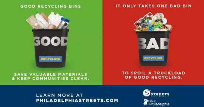 今年夏天,美國費(fèi)城在巴士候車站和廣播中投放廣告,讓人們不要把塑料袋扔到可回收垃圾箱里,“在把垃圾扔進(jìn)垃圾箱前先花一分鐘(想想)”,“如果有疑問就不要扔進(jìn)去”。