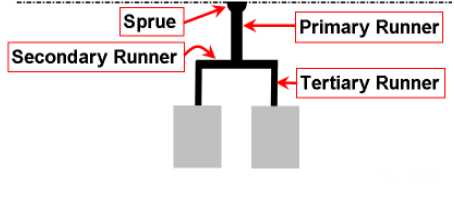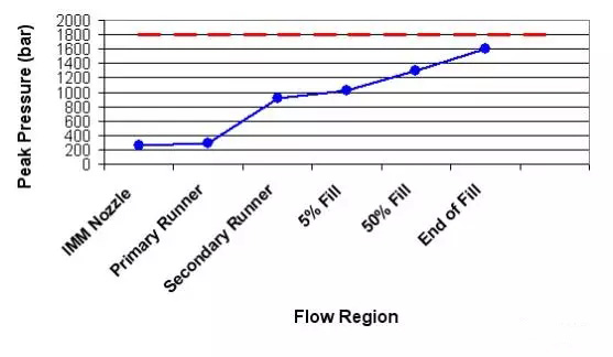 ????????通常,射出工藝不應超過90%的機臺最大壓力。在做出的壓力降曲線中,如果處于“壓力受限”或者超過90%的機臺壓力,找出壓力曲線中比較陡的一段,嘗試去減小此處的壓力損失。例如,在右圖中,次流道的壓力降很大,意味著在這一段需要很大的力量來推動塑膠的流動。加大此段的流道直徑會對降低壓力有幫助。