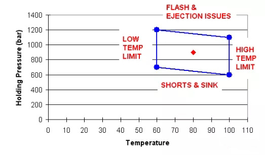 ????????成型視窗是非常重要的一個測試。通常這個外觀成型視窗是由保壓和料溫(無定形料)、保壓和模溫(結晶料)構成。