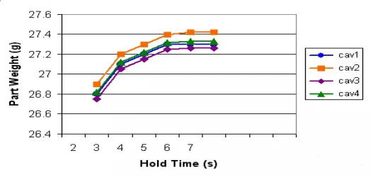 ????????曲線生成以后, 選擇一個產品重量穩定以后的時間。在上圖中,產品重量在7s后就不再增加,所以為安全起見同時彌補工藝本身的波動, 保壓時間要設定為8s。