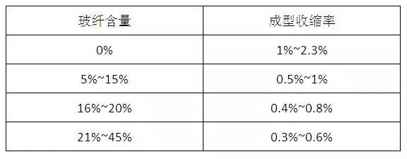 ????????玻纖加入量越多,尼龍的成型收縮率越小。但是玻纖加入量過多會造成表面浮纖、相容性差等后果,玻纖含量一般在30%左右時效果相對較好。下表是一份由經驗得到的“玻纖含量-成型收縮率”表。
