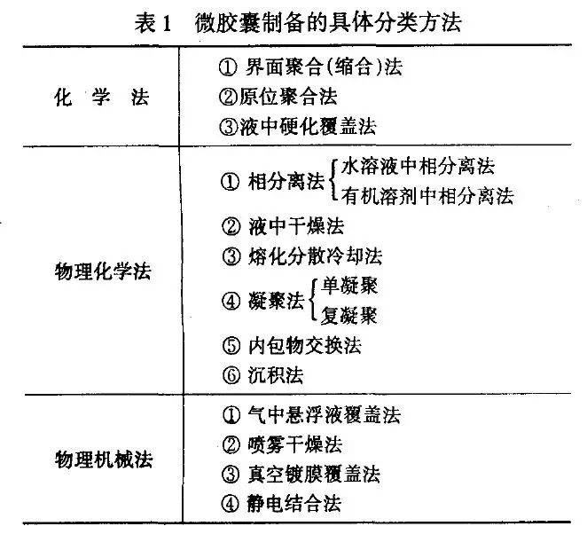 ????????微膠囊的制備方法有很多種,通常分為化學法、物理化學法和物理機械法三種,表1中列出了常見的制備方法。