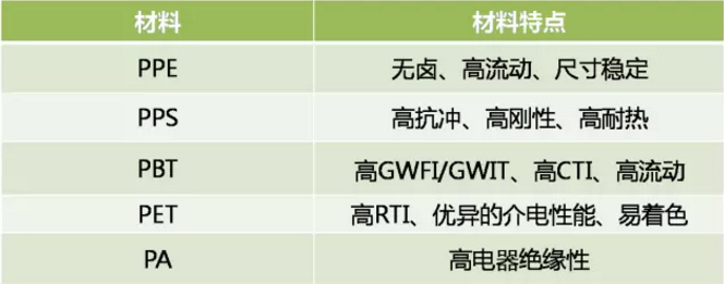 ????????電器連接件如繼電器、高壓接插件等都需要添加阻燃材料,這是基本要求。接插件金屬端子需要插拔次數多,還要求壽命要長,以免老化斷裂耐熱。目前常見的材料主要有PBT、PA等材料。