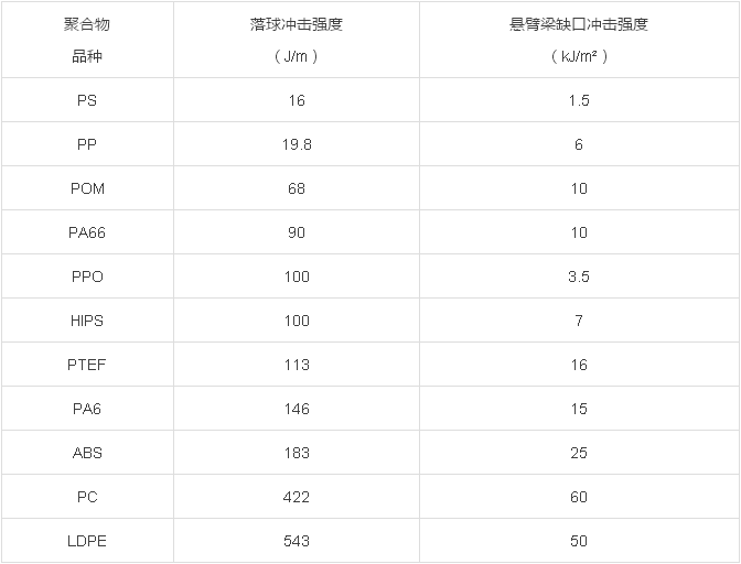 ????????不同塑料的沖擊強度相差很大,具體如表1和表2所示,以落球沖擊強度比較最大的塑料為LDPE、沖擊強度最小的為PS,以懸臂梁缺口沖擊強度比較PC最大、PS最小、PPO次之。