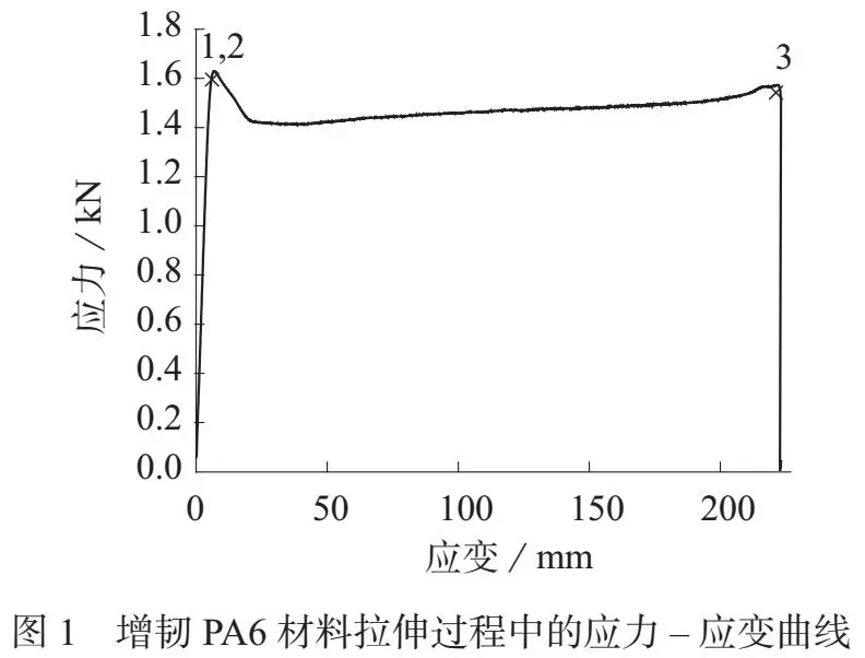 ????????拉伸強(qiáng)度在材料拉伸曲線中的位置如圖1 中的1 點(diǎn)所示。從表1 可以看到,一次擠出過程得到的增韌PA6 材料的拉伸強(qiáng)度為48.18 MPa,但是經(jīng)過二次擠出過程后,增韌PA6 材料的拉伸強(qiáng)度下降為41.47 MPa。