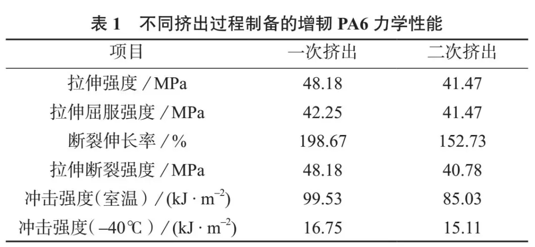 ????????以PA6、聚烯烴增韌劑、抗氧劑為原料,研究一次擠出二次擠出制備的增韌PA6 材料的拉伸強(qiáng)度、拉伸屈服強(qiáng)度、斷裂伸長率、拉伸斷裂強(qiáng)度、室溫和–40℃沖擊強(qiáng)度?