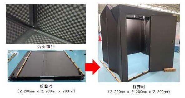 ????????該試制品是在CFRP(碳纖維復合材料)制的面板上貼合GFRP(玻璃纖維復合材料)合頁制成的約11m3的簡易型小房間,約40kg,因其十分輕量,無需使用大型機械和工具,兩個成人即可簡單搭建。