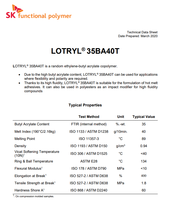 - EBA 法國阿科瑪 35BA40T 物性表, EBA 法國阿科瑪 35BA40T 產品參數,EBA 法國阿科瑪 35BA40T 性能表,EBA 法國阿科瑪 35BA40T 出廠報告, MSDS,, 物質安全資料表, UL黃卡,{ SGS報告, RoHS, 食品級認證, NSF飲用水標準, 產品資料, 產品性能, 出廠報告, 原廠原包, 代理商, 熱變形溫度, 熔指數, 流動系數, 抗沖擊性能、沖擊強度, 低溫韌性、低溫抗沖擊性能, 熔體流動系數、熔體流動速率, 加工工藝、加工參數、加工溫度, 歐盟RoHS 德國FDA 美國FDA 日本FDA